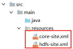 默认配置文件已经存在于依赖的jar包中。所以,只需要将Hadoop服务器的HDFS自定义配置文件(core-site.xml和hdfs-site.xml)复制到 src/main/resources目录下