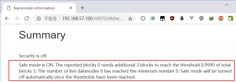 查看namenode的web ui,可以看到NameNode处于SafeMode。