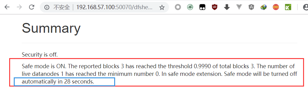 启动后,在短时间内再次查看namenode的web ui,可以看到NameNode仍处于SafeMode。total blocks有3个,接收到的reported blocks也有3个,所以 reported blocks / total blocks = 1 >= 0.9990,已经触发了关闭SafeMode的条件。因此在30秒之后,NameNode将自动关闭SafeMode