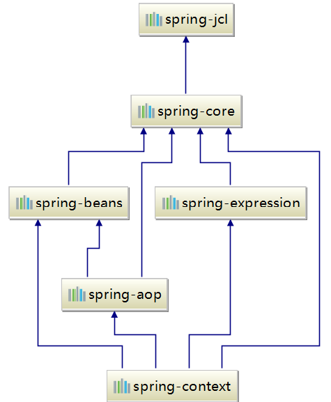 根据依赖传递,Spring核心容器只需要添加spring-context即可。在Spring5之前,核心容器还依赖commons-logging日志包,Spring5现在将commons-logging的内容集成到spring-jcl这个包下了。根据依赖传递,spring-jcl这个依赖也已经添加了,所以最后也只用添加spring-context这个依赖1