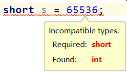 short s = 65536; // 错误。Incompatible types, Required short, Found int